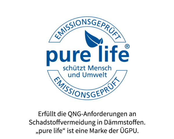 Baustoffe dürfen im eingebauten Zustand keine gesundheitsschädlichen Stoffe abgeben. Umweltzeichen wie z. B. das "pure life"-Siegel unterstützen bei der Suche nach emissions- und schadstoffarmen Dämmstoffen. Zertifizierte PU-Hartschaum Dämmprodukte, die das Umweltzeichen "pure life" tragen, sind gesundheitlich unbedenklich und für die Verwendung in Innenräumen geeignet. Sie erfüllen u. a. die Anforderungen des staatlichen Qualitätssiegel Nachhaltiges